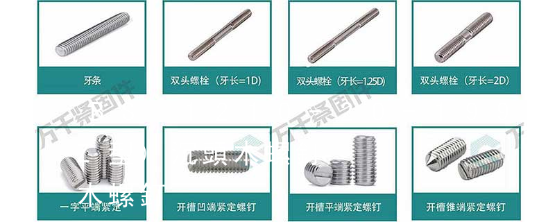 木螺釘有十字槽沉頭、十字槽半沉頭、十字槽圓頭、開槽(一字槽)沉頭、開槽半沉頭、開槽圓頭、六角頭等幾種,公稱直徑有1.6、2、2.5、3、3.5、4、5、6、7、8、10等系列,長度有6、8、10、12、16、20、25、