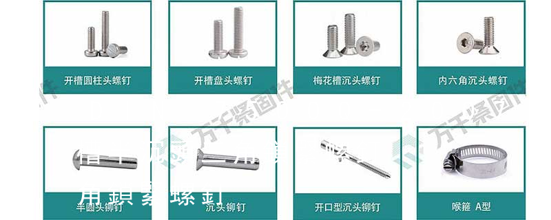 1.機螺釘 2.自攻螺釘 3.鉆尾螺釘 4.墻板釘 5.纖維板釘 6.木螺釘7.六角木螺釘 8.不脫出螺釘 9.組合螺釘 10.微型螺釘 11.家具螺釘 12.電子螺釘頭型:1.六角頭(hexagon head) 2.六角頭法蘭面(hexagon head with flange) 3.